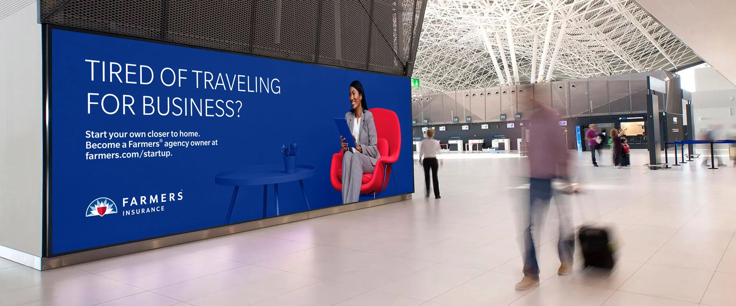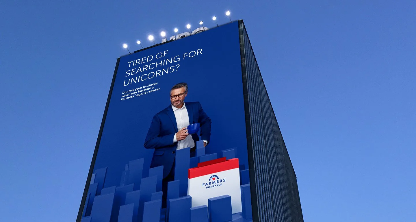 We used Farmers' traditional colors in a bold, refreshing way to grab the interest and attention of burgeoning business owners. Scenes were set in solid, blue worlds representing the strength and history of the Farmers brand while red portals served as literal openings to new opportunities awaiting the next generation of Farmers Agency Owners.