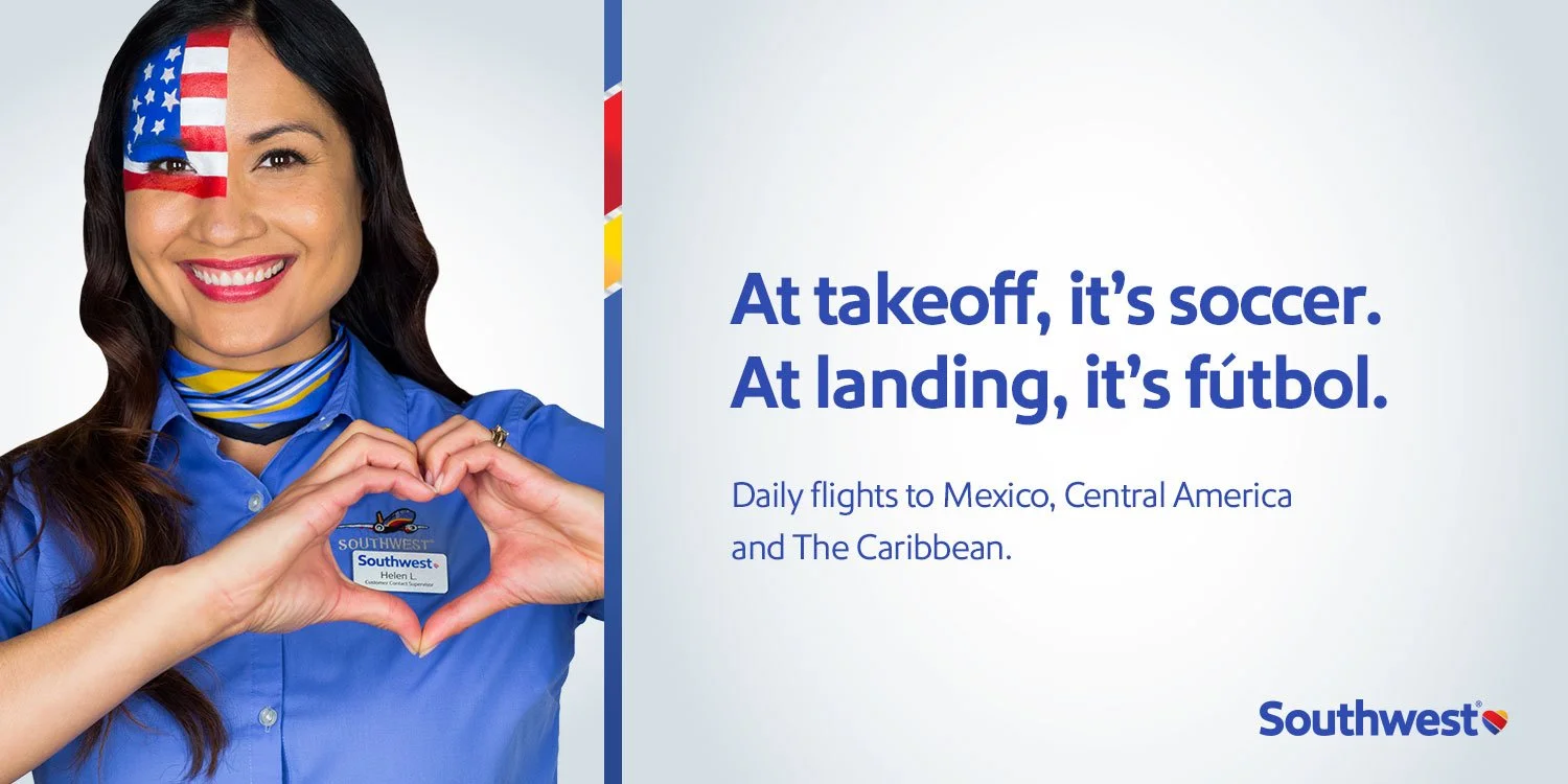 To amplify Southwest Airlines' new international destinations during the Copa América soccer tournament, we took the famous Southwest employee passion to a whole new level that needed to work in both English and Spanish. We held a sweepstakes on Twitter for a chance to win tickets to any Southwest international destination by asking excited soccer fans to show their passion for their team by tweeting a picture of themselves during the tournament. To amplify the promotion we shot real employees from destination cities with their painted faces.